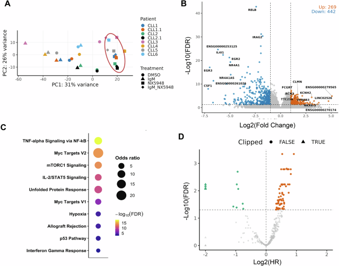 A Supervised Principal component analysis (PCA) for gene expression profiles of CLL B cells treated with DMSO, anti-IgM, NX-5948, or anti-IgM+NX-5948 across six independent donors. Only the genes consistently differentially expressed between anti-IgM+NX-5948 vs anti-IgM were used. CLL1.1 and CLL1.2 are replicates of CLL1 and CLL2. B Volcano plot of differential expression following NX-5948 treatment. A total of 269 genes were significantly upregulated and 442 downregulated (FDR < 0.05, log₂ fold change > 1). Selected genes with strong significance are labeled. C Gene set enrichment analysis of NX-5948-downregulated transcripts revealed suppression of hallmark oncogenic and stress-adaptive pathways. D Clinical relevance of NX-5948-regulated genes was evaluated using the ICGC CLL dataset. Higher expression of 67 NX-5948-downregulated genes was significantly associated with worse overall survival (OS), while higher expression of 9 was associated with better OS (FDR < 0.05).