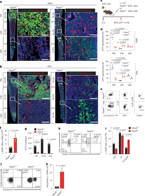 For Fig. 1a, we transplanted infected Dpp4-KO or control Lin− cells (2 × 105; infection efficiency consistently 40–50%) into lethally irradiated (1,000 cGy) C57/B6 mice (6–8 weeks old) and evaluated 2–50 weeks after transplantation. For other Dpp4 KO versus control AML models, 1 × 106 primary AML cells were transplanted C57/B6 recipients. For the homing assay, GFP+ AML cells were evaluated at 16 h. Engraftment was assessed 2 and 4 weeks after transplantation for MLL-AF9 and AML-ETO9a models, respectively. For control AML cells transplantation into N-cad+ mice with or without Cxcl12 or Gpc3, 500 L-GMPs were transplanted into sublethally irradiated (500 cGy) mice and engraftment assessed 2–8 weeks after transplantation. To preserve niche cell integrity, all mice were sublethally irradiated (500 cGy) before transplantation. The maximal leukaemia burden permitted under the approved IACUC protocol (#65384) was defined according to institutional humane endpoint criteria. Animals were monitored regularly and euthanized upon reaching predefined signs of morbidity or distress. The maximal leukaemia burden permitted by the ethics committee was not exceeded in any experiment.