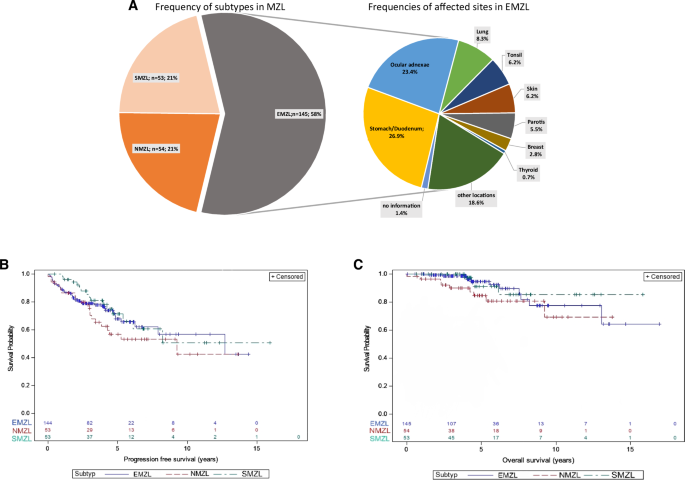 A Subtype distribution in MZL; B Progression-free survival; C Overall survival. MZL Marginal zone lymphoma, EMZL Extranodal marginal zone lymphoma, NMZL Nodal marginal zone lymphoma, SMZL Splenic marginal zone lymphoma.