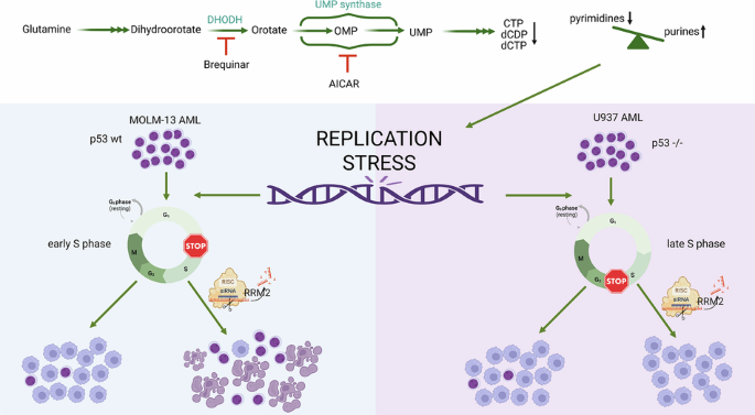 Differentiation therapy offers a promising approach in acute myeloid leukemia (AML) by overcoming the developmental block that maintains leukemic blasts. Increasing evidence indicates that DNA replication stress can promote differentiation rather than cytotoxicity; however, the metabolic mechanisms linking replication stress to differentiation remain poorly defined. Here, we investigated how perturbations in nucleotide metabolism regulate replication stress–driven differentiation. Using metabolomic and functional analyses in AML cell lines, we show that agents inducing differentiation through replication stress, including 5-aminoimidazole-4-carboxamide ribonucleoside (AICAr), dihydroorotate dehydrogenase (DHODH) inhibition, and low-dose cytarabine, converge on disruption of nucleotide pool balance. Low-dose AICAr induced a pyrimidine–purine imbalance, S phase arrest, and enhanced differentiation, whereas high-dose reduced these effects. Although brequinar and cytarabine altered nucleotide metabolism through distinct mechanisms, differentiation induced by all agents was abolished by supplementation with high levels of ribo- and deoxyribonucleosides, confirming that nucleotide imbalance is a central driver. We further identify ribonucleotide reductase (RNR) as a critical modulator of this process. Replication stress induced context-dependent regulation of RNR subunits, with RRM2 upregulated in p53-mutant U937 cells and the p53-responsive RRM2B isoform predominating in p53-wild-type MOLM-13 cells. Consistent with these differences, RRM2 depletion enhanced differentiation in U937 cells without affecting viability but impaired differentiation and survival in MOLM-13 cells. These findings position nucleotide metabolism as a key regulator of AML differentiation and suggest that combining RNR-targeted and checkpoint-modulating strategies could optimize therapeutic responses.