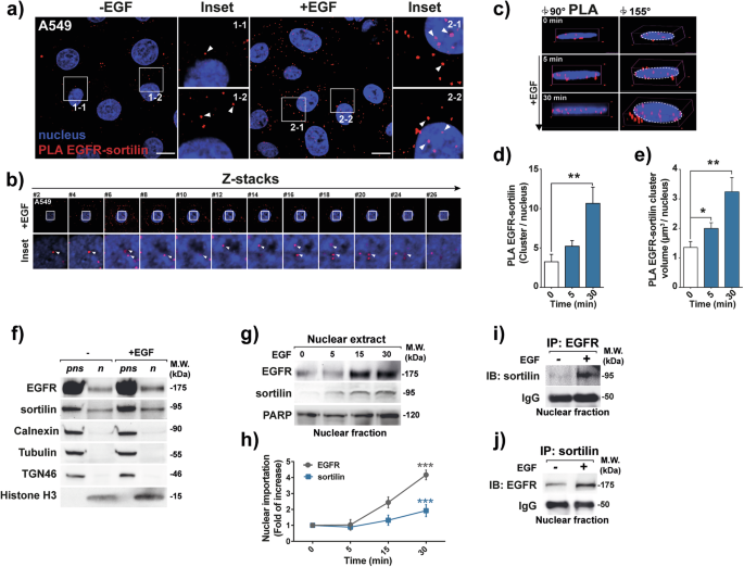 To validate these findings, we isolated nuclei and post-nuclear supernatant (pns) fractions and performed western blotting to assess protein expression. We used specific markers for Trans Golgi Network (TGN46), endoplasmic reticulum (ER) (calnexin), and cytoskeleton (tubulin) to exclude cytoplasmic contamination in the nuclear fraction. Histone H3, a chromatin packaging protein, was used as a marker for the nuclear fraction. Our analysis revealed both EGFR and sortilin expression in the nuclei of EGF-stimulated cells (Fig. f), with expression increasing significantly at 30 min (p < 0.001, Fig. 1g, h). These results corroborate confocal images, indicating translocation of EGFR and sortilin to the nuclei in response to EGF stimulation. Immunoprecipitation from isolated nuclei also demonstrated an increase in EGFR–sortilin complexes following EGF stimulation (Fig. 1i, j), further supporting the findings from PLA assay.